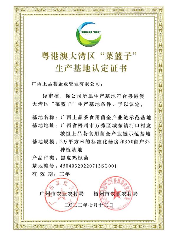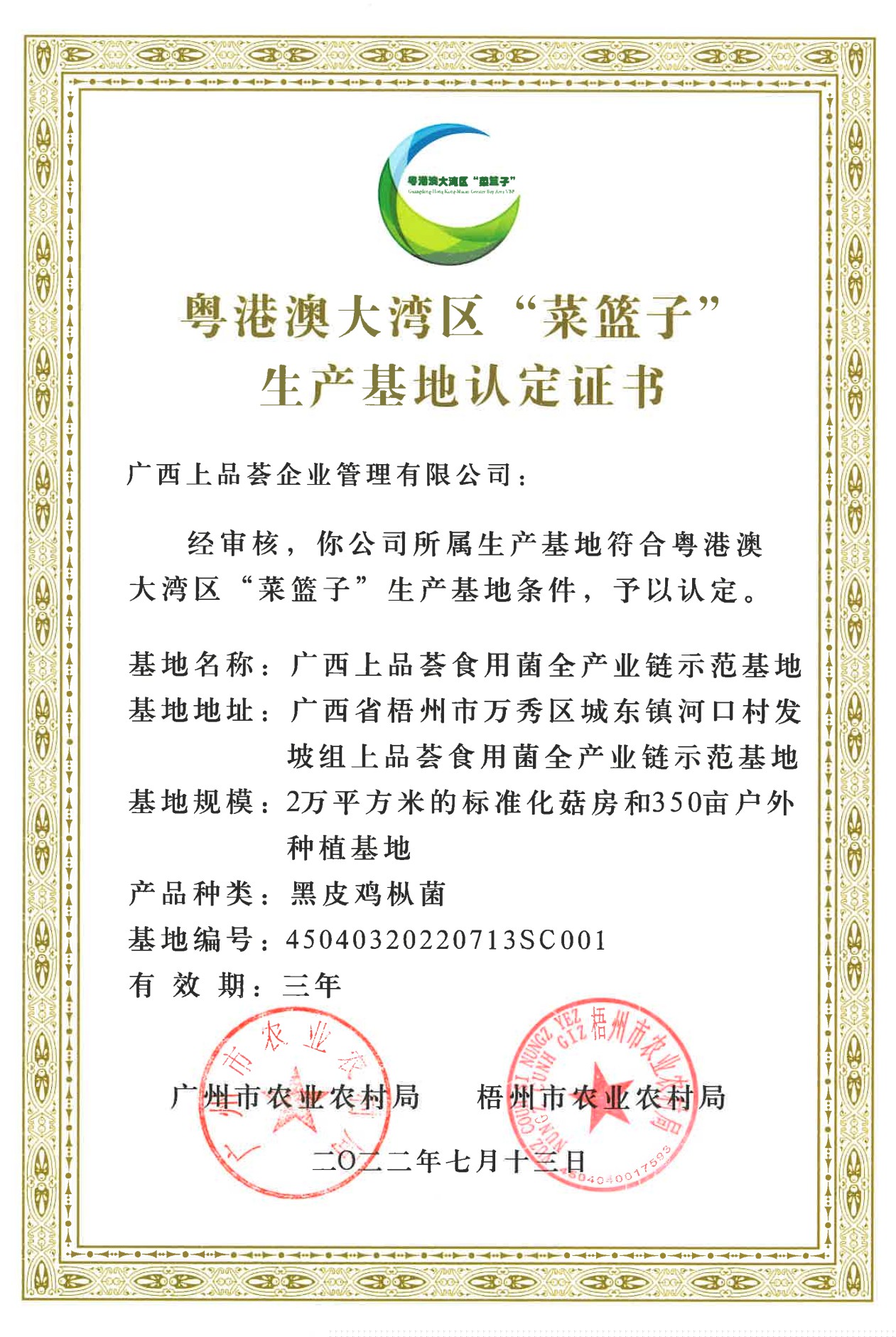 粵港澳區(qū)“菜籃子”生產(chǎn)基地認定證書